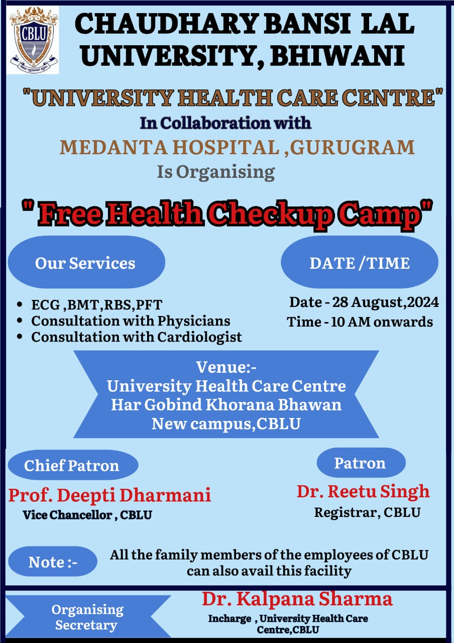 Free health check-up camp on 28/8/2024 from 10:00 am onwards