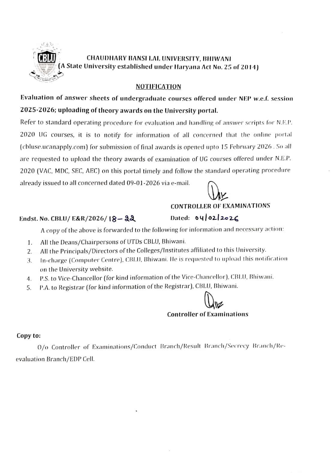 - Notification regarding Evaluation of answer sheets of undergraduate courses offered under NEP w.e.f. session 2025-2026 (04/02/2026)